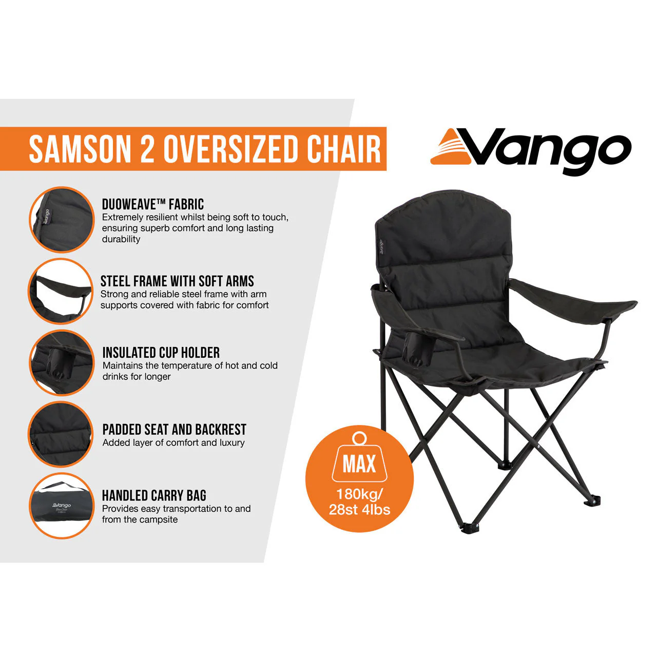 The Samson 2 Oversized chair is a spacious place to relax in the garden or on the campsite thanks to the oversized design and features a handy insulated cup holder for hot chocolate or cool refreshments which maintains their temperature. This seat is perfect for outdoor living with a robust steel frame featuring soft arms and luxurious padding.